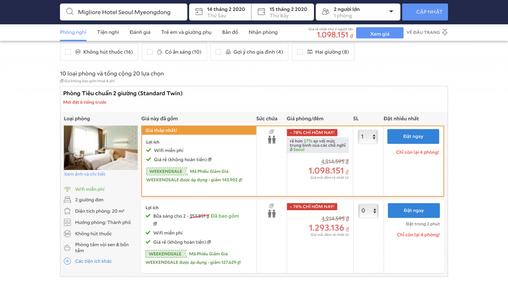 Mình chưa phải đại gia, kiểu mua sắm không cần nhìn giá :D, nên mỗi lần đặt khách sạn cũng đều phải đắn đo chi phí. Nếu khách sạn rẻ quá thì thường cũ và bẩn. Đi chơi cả ngày đã mệt rồi tối về còn ở khó chịu nữa thì thà ở nhà còn hơn. Thế nên ngân sách mà bọn mình dành cho chỗ ở thường khoảng 1.5tr/đêm cho 2 đứa. Cũng là hợp lý với những thành phố lớn như Seoul.