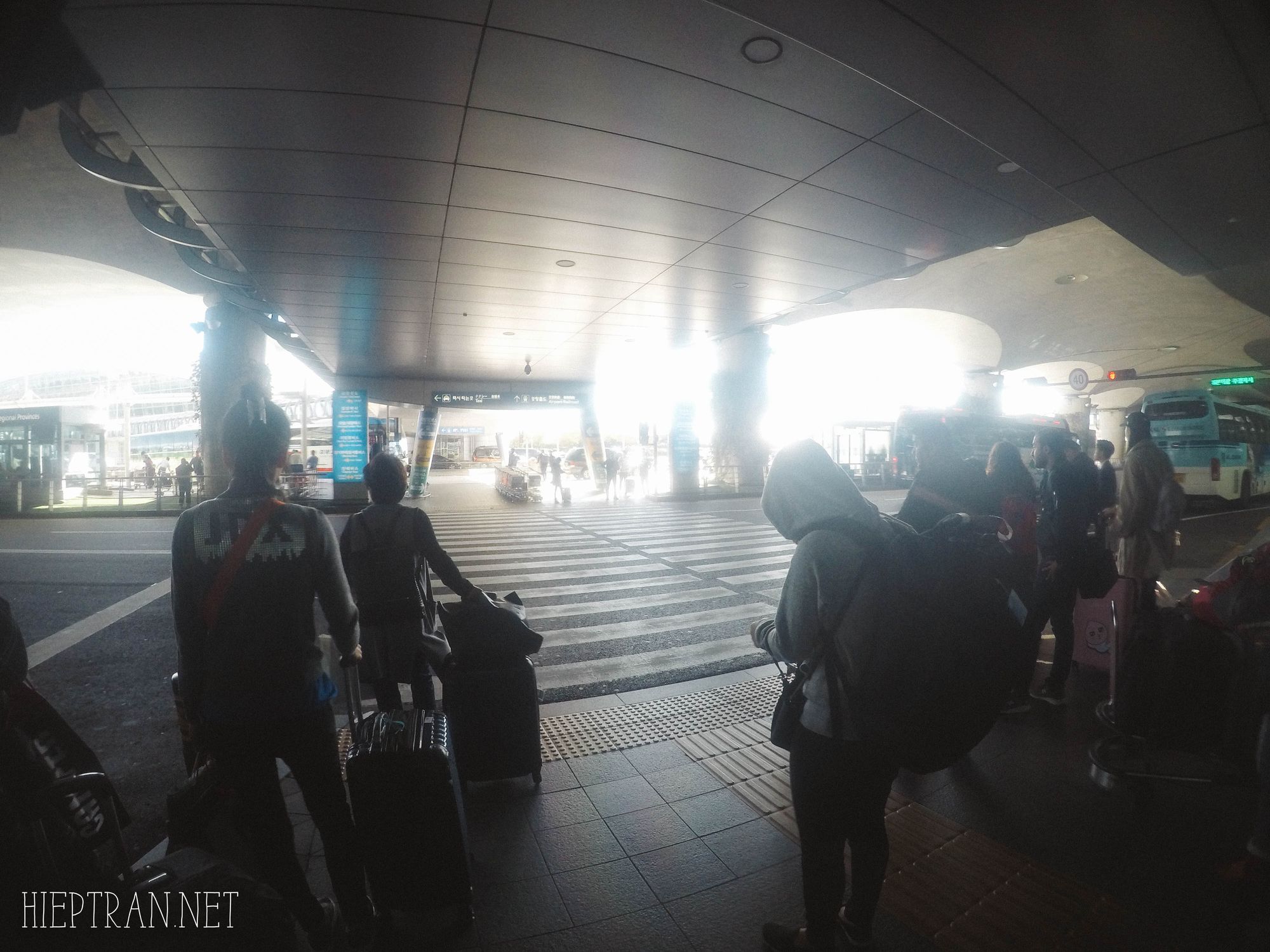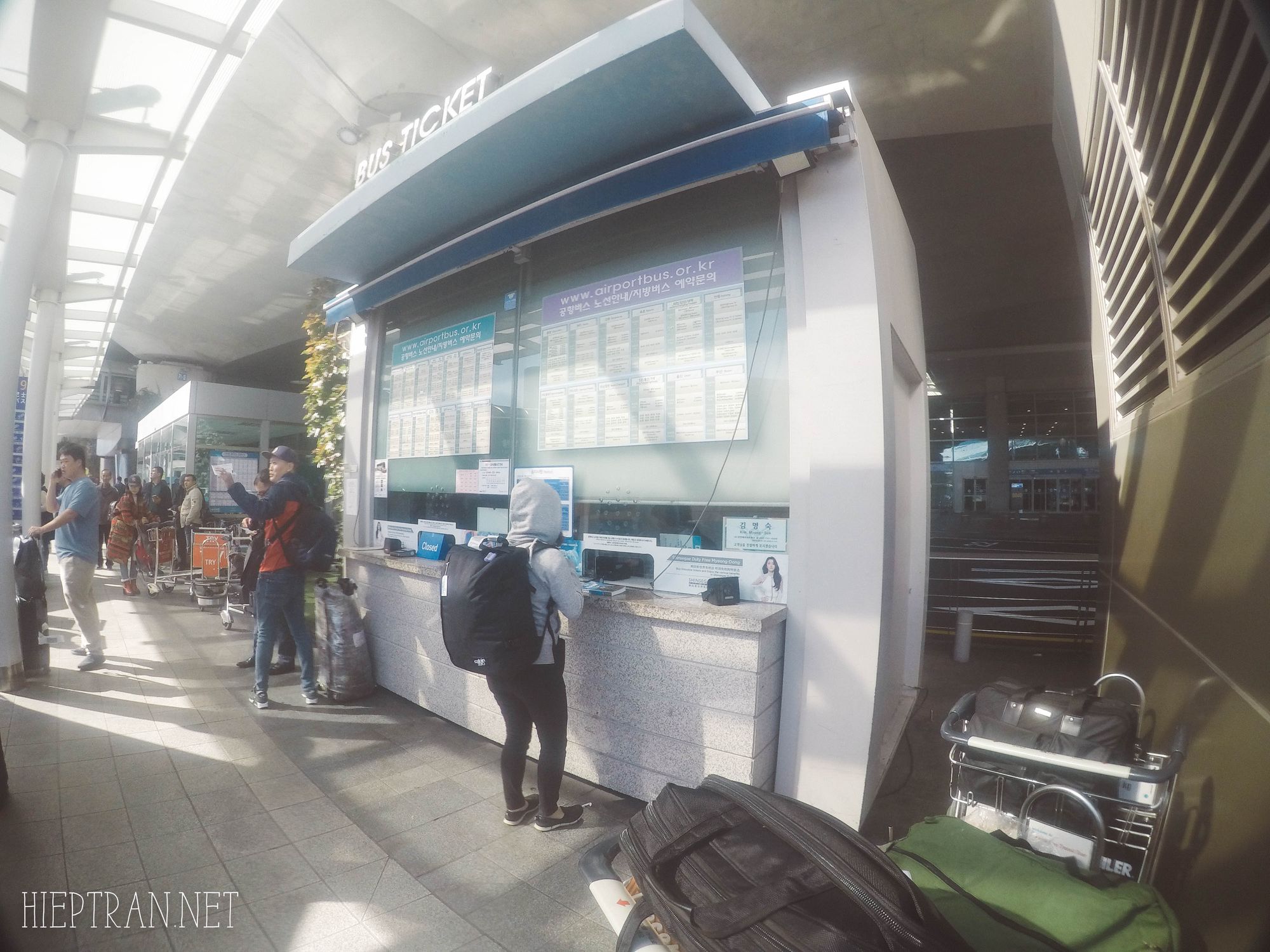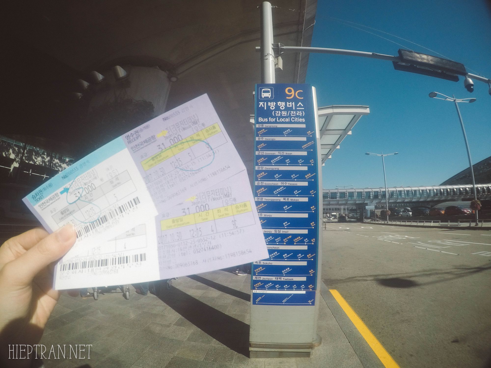 – Sau khi làm thủ tục nhập cảnh xong, bạn xuống tầng 1 của sân bay Incheon, tìm đến cổng số 9C (phía bên kia đường) để đến trạm xe buýt đi các tỉnh khác (Other Province Bus) mua vé và chờ lên xe. Trung bình mỗi tiếng có 2 chuyến, chuyến đầu tiên vào lúc 06:00, chuyến cuối cùng vào lúc 22:45. Giá vé là 31.000 won (620K VND), xe limousine xịn, có wifi, nước uống miễn phí.
