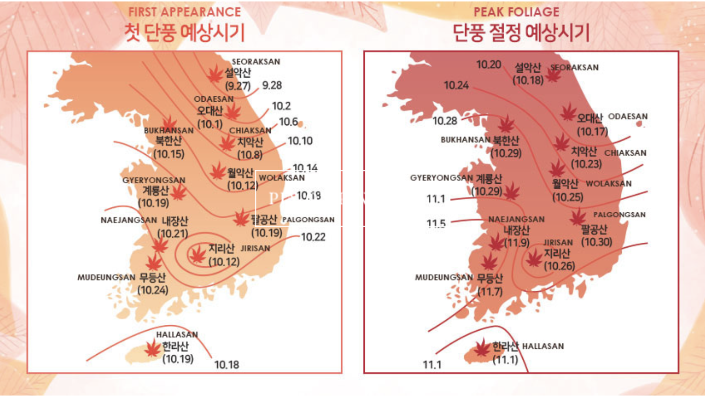 Mỗi năm đều có thời gian thay lá, là lúc toàn bộ lá chuyển sang sắc vàng sắc đỏ, khác nhau; và thời gian này cũng khác nhau theo từng địa phương. Tuy nhiên, nhìn chung thì bạn cứ đến Hàn Quốc trong khoảng cuối tháng 10, và tuần đầu tiên của tháng 11 là đẹp nhất.