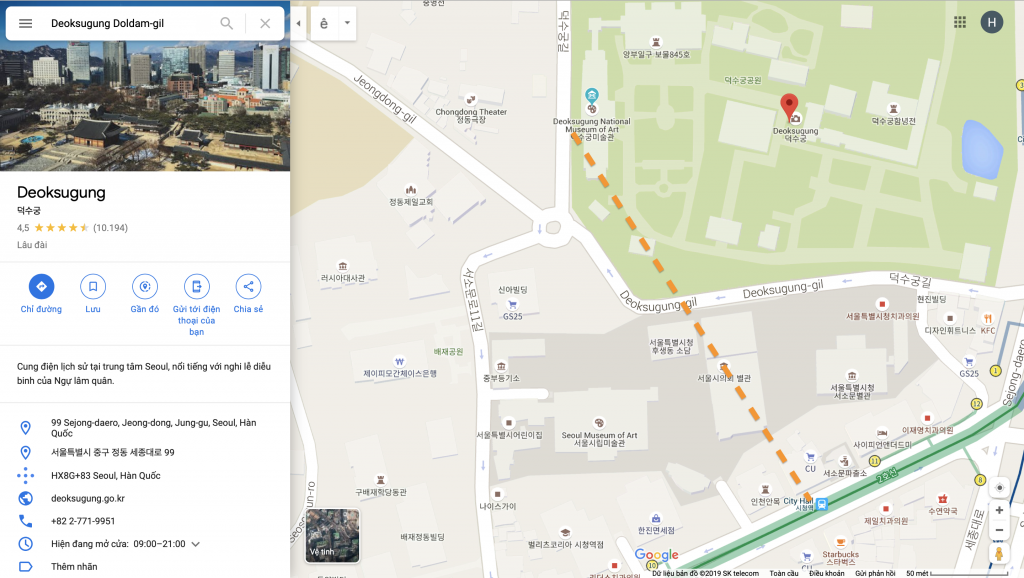 Cạnh cung điện Deoksugung (đối diện Tòa thị chánh City Hall) là con đường dài khoảng 900m rợp lá vàng vào mùa thu.